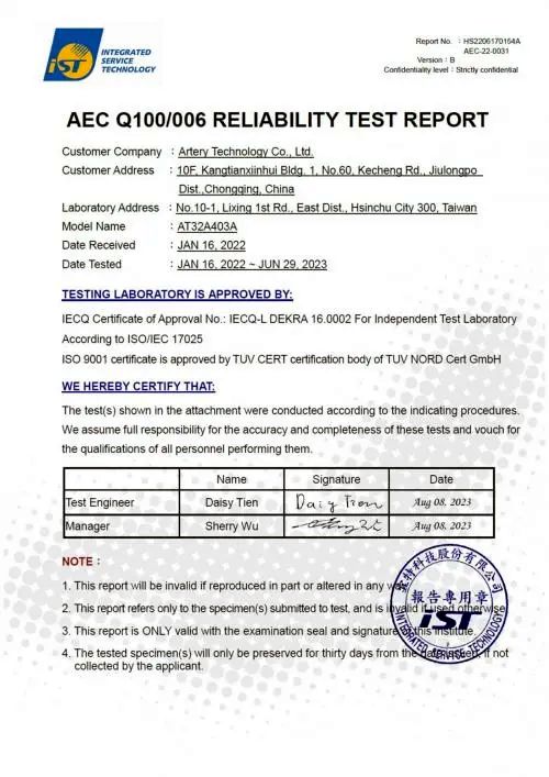 AEC-Q100認證是汽車電子委員會(Automotive Electronics Council)制定的車用電子元件可靠性測試標準,在全球汽車產業都具有極高的權威性。AEC-Q100認證門檻高,測試項目覆蓋廣,對芯片產品的設計質量、安全性、可靠性要求極為嚴苛,是集成電路廠家進入汽車領域的重要通行證。AT32A403A通過AEC-Q100認證,標志著雅特力車規級MCU性能與可靠性等指標符合國際車規芯片標準,產品質量獲得國際權威認證體系的認可和肯定。
