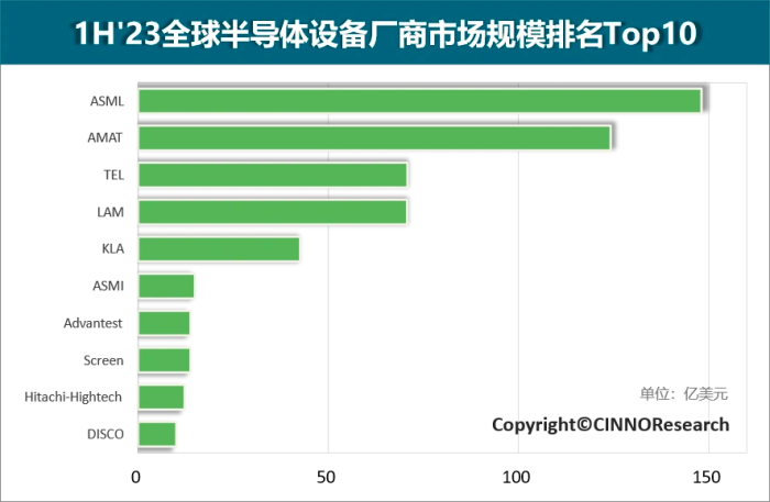 1H'23全球半導體設備廠商市場規模排名Top10,來源:CINNO ? IC Research