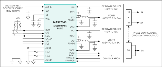 兩個3A降壓轉(zhuǎn)換器(1Φ)或一個6A降壓轉(zhuǎn)換器(2Φ)